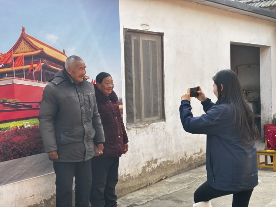 近日,天与智慧养老服务(建湖)有限公司再度开启暖心行动。工作人员深入乡村,为辖区居家服务对象的老人们拍摄了一组特别的新年纪念照。以“天安门广场”为背景,他们用一方精心印制的背景布,将首都的庄严与荣光搬进农家小院,为那些一生扎根乡土、从未踏足北京的老人,圆了一场藏在心底的家国梦。