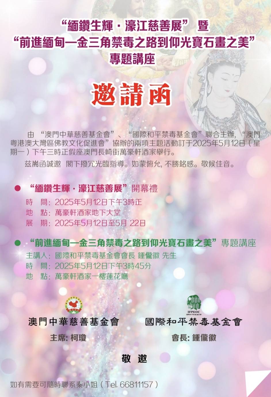近日,记者获悉,由“澳门中华慈善基金会”与“国际和平禁毒基金会”联合主办,“澳门粤港澳大湾区佛教文化促进会”协办的“缅钻生辉·濠江慈善展”暨“前进缅甸—金三角禁毒之路到仰光宝石画之美”专题讲座,将于2025年5月12日(星期一)下午三时在澳门长崎街万豪轩酒家盛大启幕。此次活动以慈善与禁毒为核心,旨在凝聚社会力量,助力公益事业发展。