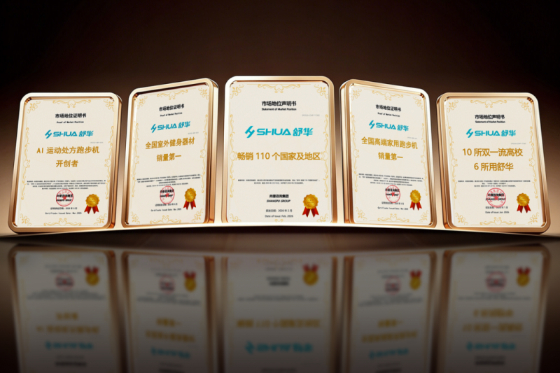 基于深厚的技术积累与产品创新以及品牌、渠道建设,舒华在市场上的领先地位也获得了权威认证。知名市场研究机构尚普咨询正式为舒华颁发“畅销110个国家及地区”“全国高端家用跑步机销量第一”“全国室外健身器材销量第一 ”“10所双一流高校 6所用舒华”“AI运动处方跑步机开创者”等五大市场地位认证。这些沉甸甸的荣誉,不仅是对舒华过去30年奋斗成果的肯定,更为“中国第一、世界前三”的战略目标奠定了坚实的市场基础。