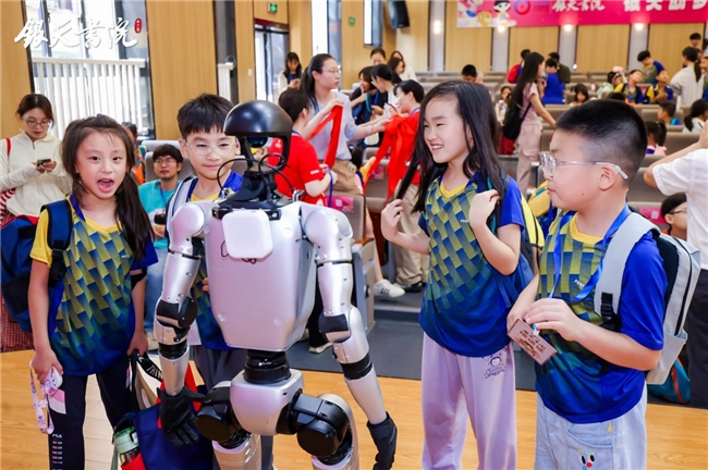 开营仪式上热闹非凡,银泰百货的机器人员工 “小泰” 一亮相便深受孩子们的欢迎。孩子们争相与 “小泰” 握手、拥抱,在欢快的音乐声中,还跟着 “小泰” 一起跳舞,现场充满了欢声笑语。北京大学新信院青少年AI教育实验室课研组研究员布丁老师(褚文希)为学员带来了“开营第一课”《用AI重新定义学习的可能性》。